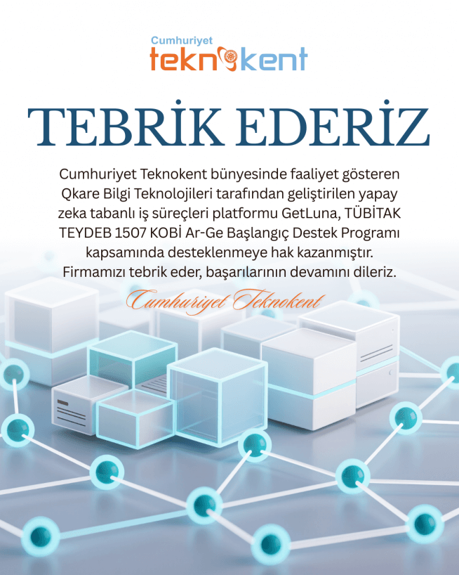 Cumhuriyet Teknokent bünyesinde faaliyet gösteren QKARE Bilgi Teknolojileri tarafından geliştirilen yapay zeka tabanlı iş süreçleri platformu getLuna, TÜBİTAK TEYDEB 1507 KOBİ Ar-Ge Başlangıç Destek Programı kapsamında desteklenmeye hak kazanmıştır. Firma sahibi Selim ATAŞ liderliğinde yürütülen proje, Sivas Cumhuriyet Üniversitesi Mühendislik Fakültesi Bilgisayar Mühendisliği Bölümü Öğretim Üyesi Doç. Dr. Kemal ADEM danışmanlığında gerçekleştirilecektir. İnsan kaynakları ve finansal operasyonları tek bir modüler yapı altında birleştirmeyi hedefleyen getLuna projesi yarı otonom mülakat avatarı, doğal dil işleme (NLP) ve büyük dil modelleri (LLM) tabanlı CV standardizasyonu ve aday-ilan eşleştirme, makine öğrenmesi/derin öğrenme destekli anomali tespiti ve açıklanabilir yapay zeka (XAI) bileşenleri ile öne çıkmaktadır.