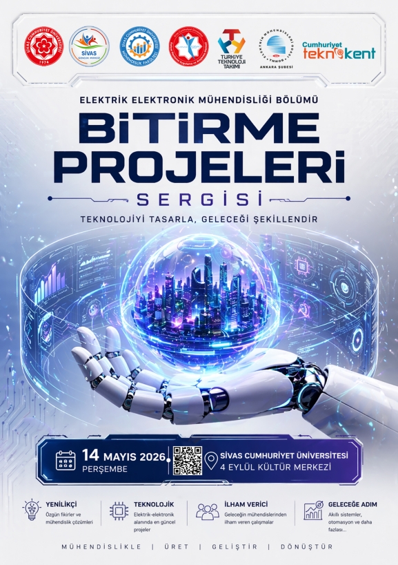 Cumhuriyet Teknokent olarak, Sivas Cumhuriyet Üniversitesi Elektrik-Elektronik Mühendisliği Bölümü Bitirme Projeleri Sergisi 14 Mayıs 2026 tarihinde düzenlenecektir. İl protokolümüz ve üniversite öğrencilerinin ziyaretine açık olacak bu etkinlikte, öğrencilerimizin hazırladığı projeler sergilenecektir.